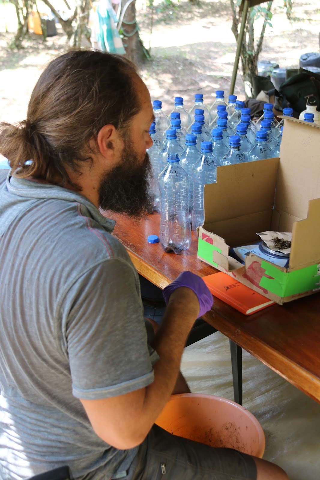 | Chris weighing hippo poop into a bottle |