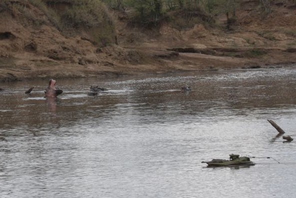 Everything went remarkably well, and we surveyed hippo pool after hippo pool, increasingly confident in the boat’s ability to deter the hippos, and our boat driver’s ability to avoid the hippos. Of course, just when you’re getting comfortable is when nature will choose to remind you who’s really in charge. We were surveying the last hippo pool of the day, which was down inside a deeply incised river channel. The hippos at this pool seemed especially ornery, and we had to launch the boat about 100 meters downstream of the hippo pool in order to approach the river safely. It was difficult to walk down to the river and launch the boat, because the banks were so steep and the edge of the riverbank dropped off quickly. All of this contributed to a general sense of unease as we watched our pilot slowly navigate the boat upstream.